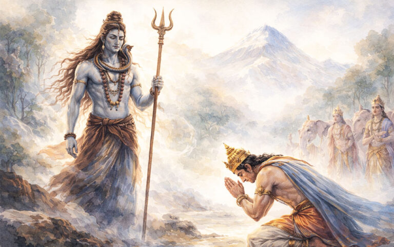 In that unmoving silence, a deeper realization dawned. Indra understood that all his power was useless against someone who had nothing to defend and nothing to prove. His pride shattered. The illusion of supremacy collapsed. At that moment, the ascetic revealed his true form. Divine radiance filled the space, the heavens trembled, and Indra realized that the Avadhoot before him was none other than Lord Shiva himself.